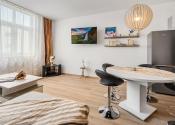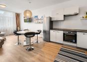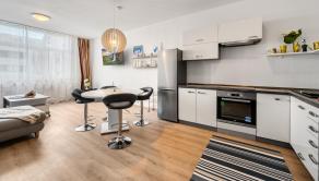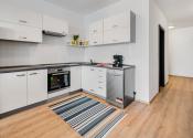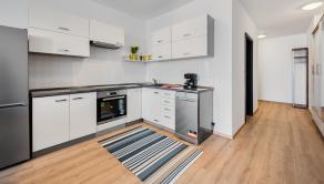 -kuchyňa vybavená kuchynskou linkou, ktorej súčasťou je indukčná varná doska, digestor, teplovzdušná rúra, umývačka riadu a chladnička s mrazničkou