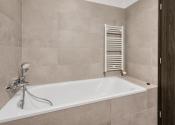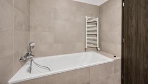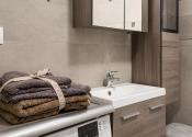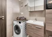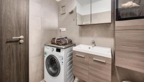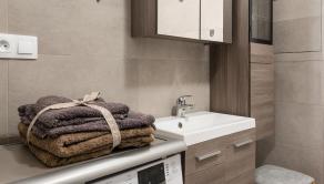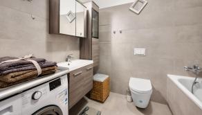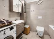 -kúpeľňa s vaňou, umývadlom, zrkadlom, skrinkami, práčkou a WC