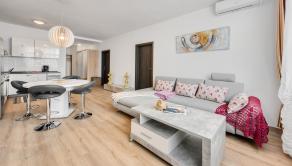 -obývacia izba s veľkou sedačkou, TV, klimatizáciou, stolíkmi, jedálenským stolom so stoličkami