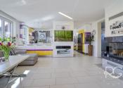 -priestranná obývačka s krbom a veľkoformátovým oknom s HS portálom spojená s kuchyňou