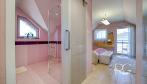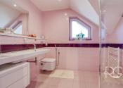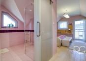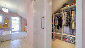 kútom, toaletou a umývadlom so zásuvkami, walk-in šatníkom a balkónom