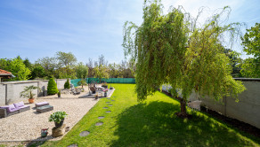 -krytá terasa spojená s veľkou slnečnou záhradou, slúžiacou majiteľom na relax, vkusne upravená okrasnými drevinami s dôrazom na nenáročnú údržbu