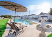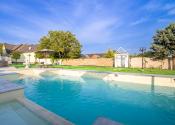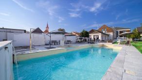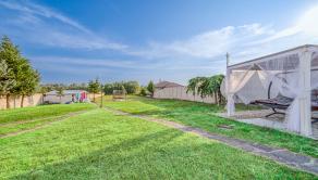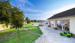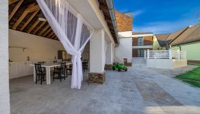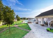 V júni 2024 bolo vydané platné stavebné povolenie na prestrešenie a uzavretie bazénu, ktorým nový majiteľ získa prepojenie s domom prechodom cez chodbu a zimnú záhradu, čím vznikne ďalšia zastavaná plocha o výmere 250 m2. Samotný plavecký bazén rímskeho typu má rozmery 5 x 15 m a jeho hĺbka je 1,5 m a je spojený s detským bazénom s rozmermi 2,5 x 3 metre a hĺbkou 45 cm. Oba sú vybavené teplovodným vodopádom, celá relaxačná zóna okolo bazéna je pokrytá mramorovou dlažbou a vyhrievanie pomocou tepelného čerpadla je samozrejmosťou. K dispozícii sú 2 sprchy, nerezová s teplou vodou je priamo pri bazéne a druhá solárna sprcha je pod samostatnou drevenou strieškou pár metrov od bazéna, k dispozícii je aj jacuzzi a arabský stan s lehátkom. Tento impozantný dom, nachádzajúci sa v tichej a kľudnej lokalite, má výborné dispozičné riešenie a predáva sa zariadený novým nábytkom. Napriek svojej enormnej výmere má veľmi nízke prevádzkové náklady, disponuje energetickým certifikátom A1 a má povolenie na inštaláciu 2 tepelných čerpadiel vzduch – voda, ktoré sa dajú v lete využívať na chladenie, vďaka čomu nie je potrebné inštalovať v dome klimatizáciu. Na strechu zimnej záhrady je možné osadiť fotovoltaické panely, čím sa prevádzkové náklady ešte viac optimalizujú. Kúrenie je dvojokruhové teplovodné podlahové zabezpečené pravidelne servisovaným vysokovýhrevným plynovým kotlom Vaillant s 200 litrovým zásobníkom a na oknách je trojsklo. Nový majiteľ rozhodne ocení nadštandardne veľkú zatrávnenú slnečnú záhradu s dospelou vegetáciou s automatickou závlahou, ktorá otvára možnosti vybudovania buď ďalších stavieb, alebo sa môže kreatívne realizovať pri vysadení ďalších okrasných drevín podľa vlastných predstáv a dotvoriť tak túto dokonalú oázu oddychu s dostatkom súkromia a nádherným výhľadom na kostolnú vežu a do zelene. Na pozemku je aj drevený sklad náradia, na ktorý je možné vďaka stavebnému povoleniu z júna 2024 nainštalovať fotovoltaické panely, na pozemok sa bude umožnený prístup aj zo zadnej strany. K dispozícii sú všetky inžinierske siete, optický kábel, alarm a kamery. Okrem parkovania áut v dvojgaráži, je možné parkovať ďalšie 3 autá na pozemku za bránou a ďalšie 3 autá možu parkovať pred domom. Táto vila skutočne uspokojí aj náročného klienta, je určená pre väčšiu rodinu a je možné v nej spojiť aj bývanie s podnikaním.