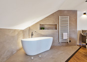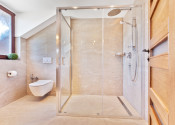 Kúpeľňa: sprchový kút so sklenenou zástenou keramické umývadlo, závesne WC , samostatne stojaca vaňa