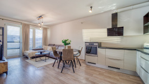 Realitná kancelária PORTO REAL GROUP vám exkluzívne ponúka na prenájom krásny kompletne zariadený 2-izbový byt vo vyhľadávanej mestskej časti Bratislava – Ružinov na ulici Na križovatkách situovaný na 5/10 NP v novostavbe. Ide o rezidenčný projekt "Galvaniho Dvory", ktorý bol skolaudovaný v roku 2019, disponuje pekným moderným a upraveným vnútroblokom a je vybavený kamerovým systémom. Byt má výbornú dispozíciu a krásnu svetelnosť a je moderne a nadčasovo zariadený štýlovým nábytkom na mieru. Jeho celková výmera je 52,28 m2, disponuje pivničnou kobkou na prízemí o výmere 2 m2 a balkónom s pekným výhľadom o výmere 4,44 m2. Vstupná chodba disponuje vstavanou skriňou, vešiakovou stenou s poličkami na topánky a taburetkou. V kúpeľni je vaňa, umývadlo so skrinkou, toaleta, práčka a sušička. Spálňa je vybavená vstavanými skriňami na mieru, ktoré poskytujú skutočne veľa úložného priestoru. K dispozícii je manželská posteľ s kvalitným matracom. Obývacia miestnosť je spojená s kuchyňou a dostanete sa z nej na priestrannú loggiu, ktorá je vybavená exteriérovými stoličkami so stolíkom a je orientovaná ako aj celý byt do pekného tichého vnútrobloku kde je k dispozícii aj detské ihrisko. Kuchyňa je vybavená kuchynskou linkou na mieru so všetkými spotrebičmi a jedálenským stolom so 4 stoličkami. Obývacej izbe dominuje dizajnová sedacia súprava s konferenčným stolíkom oproti ktorej je stolík pod TV s televízorom a poličkový regál. K dispozícii je videovrátnik a alarm, okná sú vyššej kvality s izolačným 3-sklom a exteriérovými elektrickými žalúziami. Benefitom je aj možnosť prenájmu vonkajšieho parkovacieho státia hneď pred vchodom (nie je podmienkou).