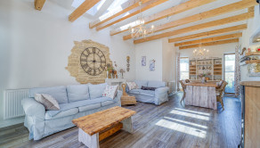 -obývacia izba spojená s kuchyňou vybavenou kuchynskou linkou so všetkými spotrebičmi -umývačka riadu, chladnička s mrazničkou a digestor, sklokeramická varná doska, elektrická rúra a mikrovlnná rúra