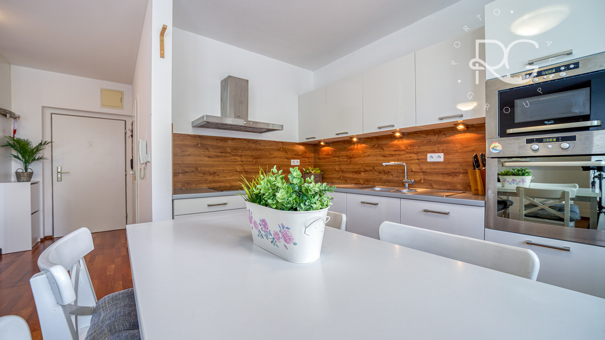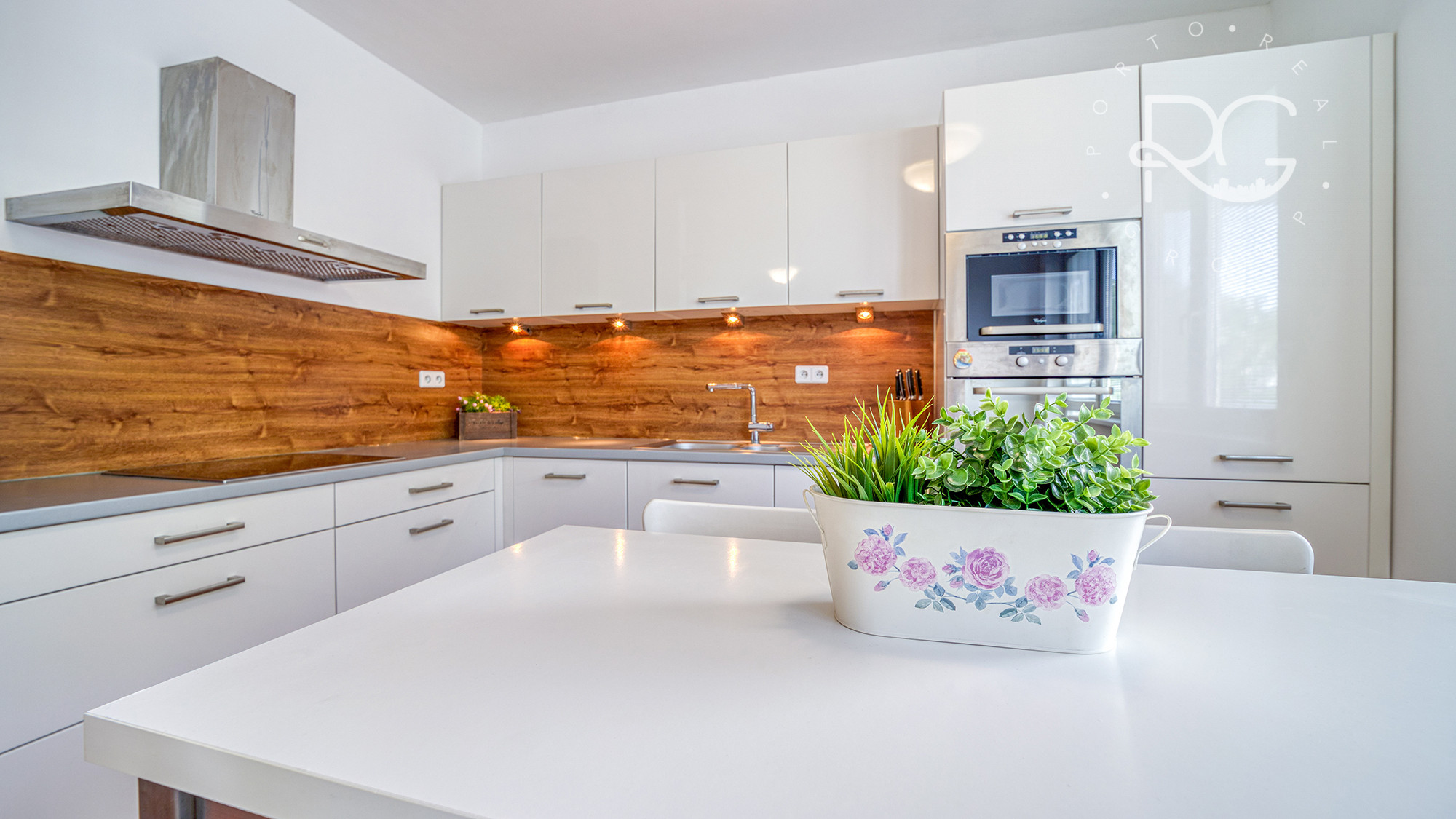 - kompletne a moderne zariadený (umývačka riadu, elektrická rúra, sklokeramická varná doska, mikrovlnná rúra, chladnička s mrazničkou, práčka,....)