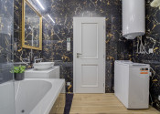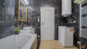- kúpeľňa vybavená vaňou, toaletou s bidetovou sprchou, umývadlom so zásuvkami, práčkou a zrkadlom