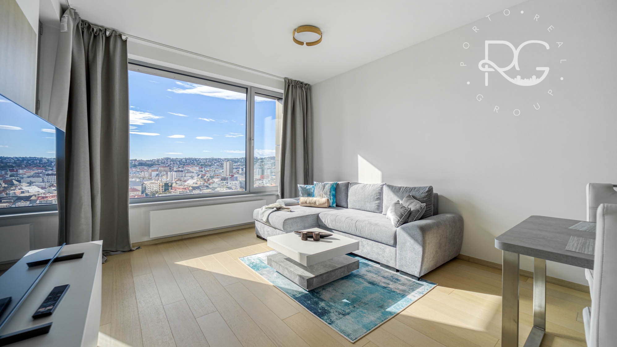 =PRENAJATÉ= Realitná kancelária PORTO REAL GROUP Vám ponúka na prenájom zariadený 2-izbový byt v prestížnom komplexe SKY PARK, ktorý sa nachádza na ulici Továrenska - Bratislava I. Byt sa nachádza na 15/30 poschodí, ktoré ponúka magický výhľad na celé Staré mesto. Na poslednom 30 poschodí sa nachádza vyhliadková terasa, ktorá umožňuje romantické chvíle s výhľadom na celú BRATISLAVU, ako aj na východy a západy slnka. Túto možnosť majú len rezidenti a nájomníci komplexu. K bytu je aj pivničná kobka a parkovacie státie. Byt je na mieru kompletne zariadený so zabudovanými spotrebičmi.