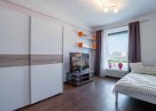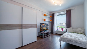 -neprechodná izba so vstavanými skriňami, posteľou, stolíkom a televízorom