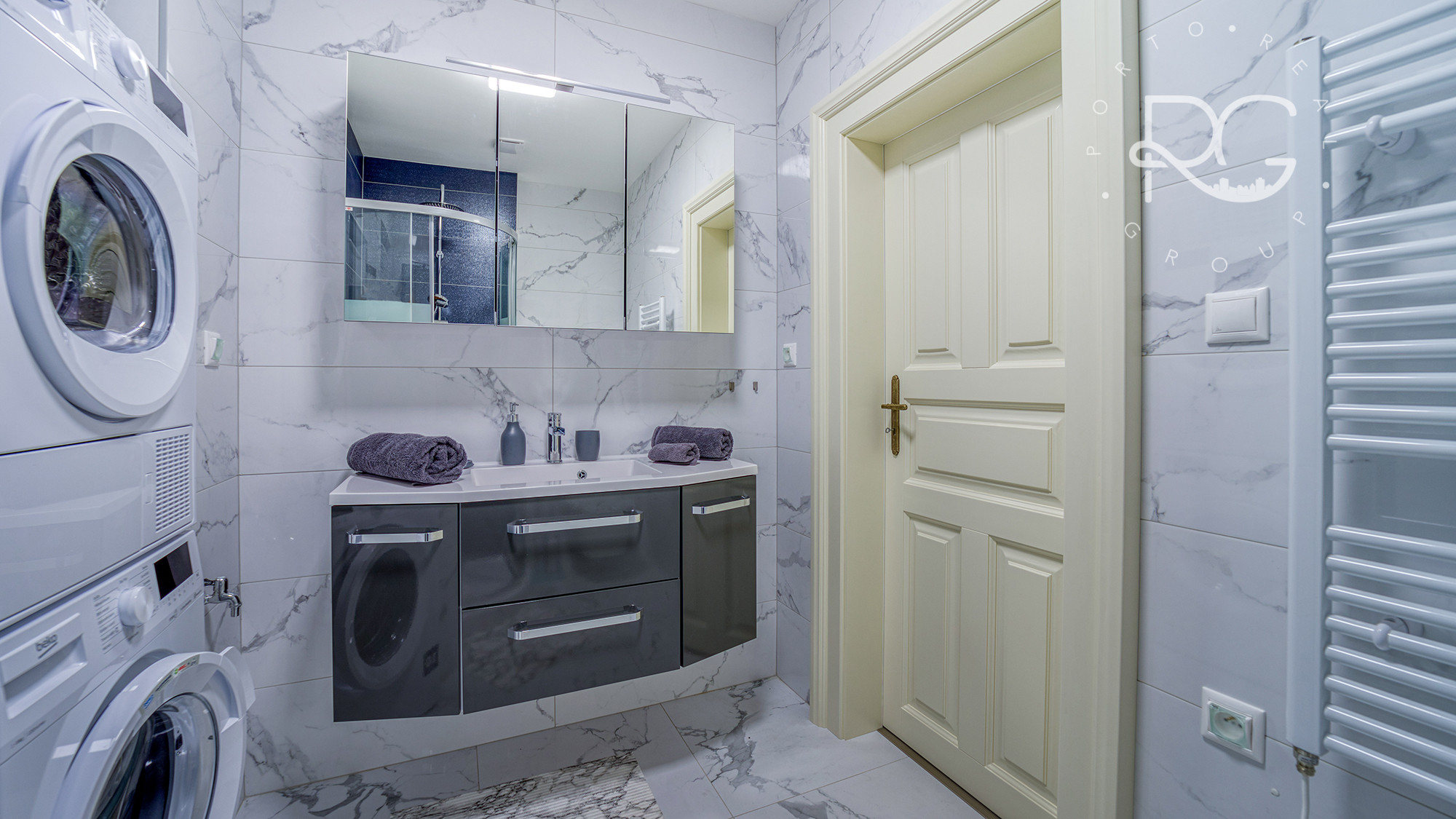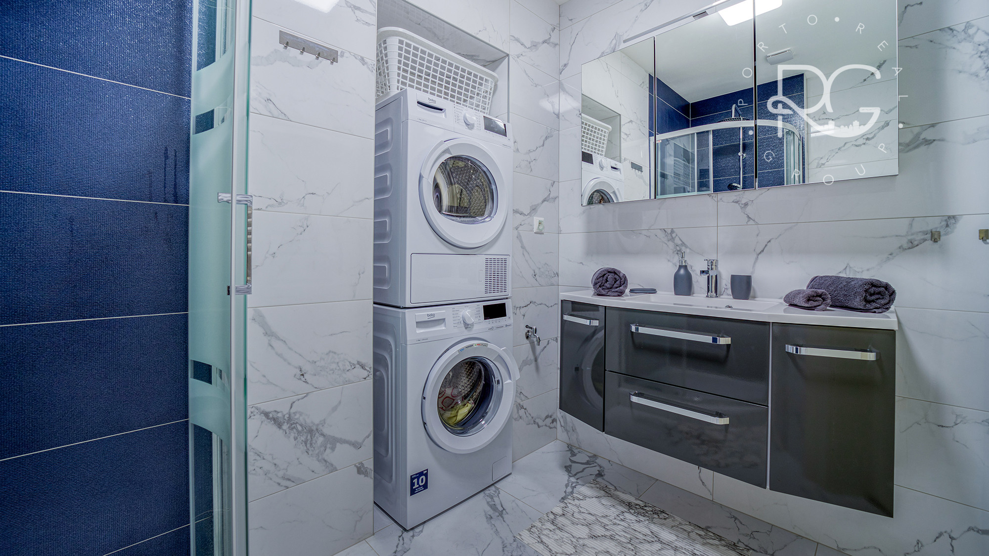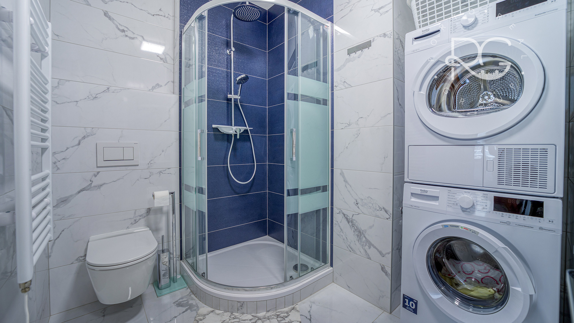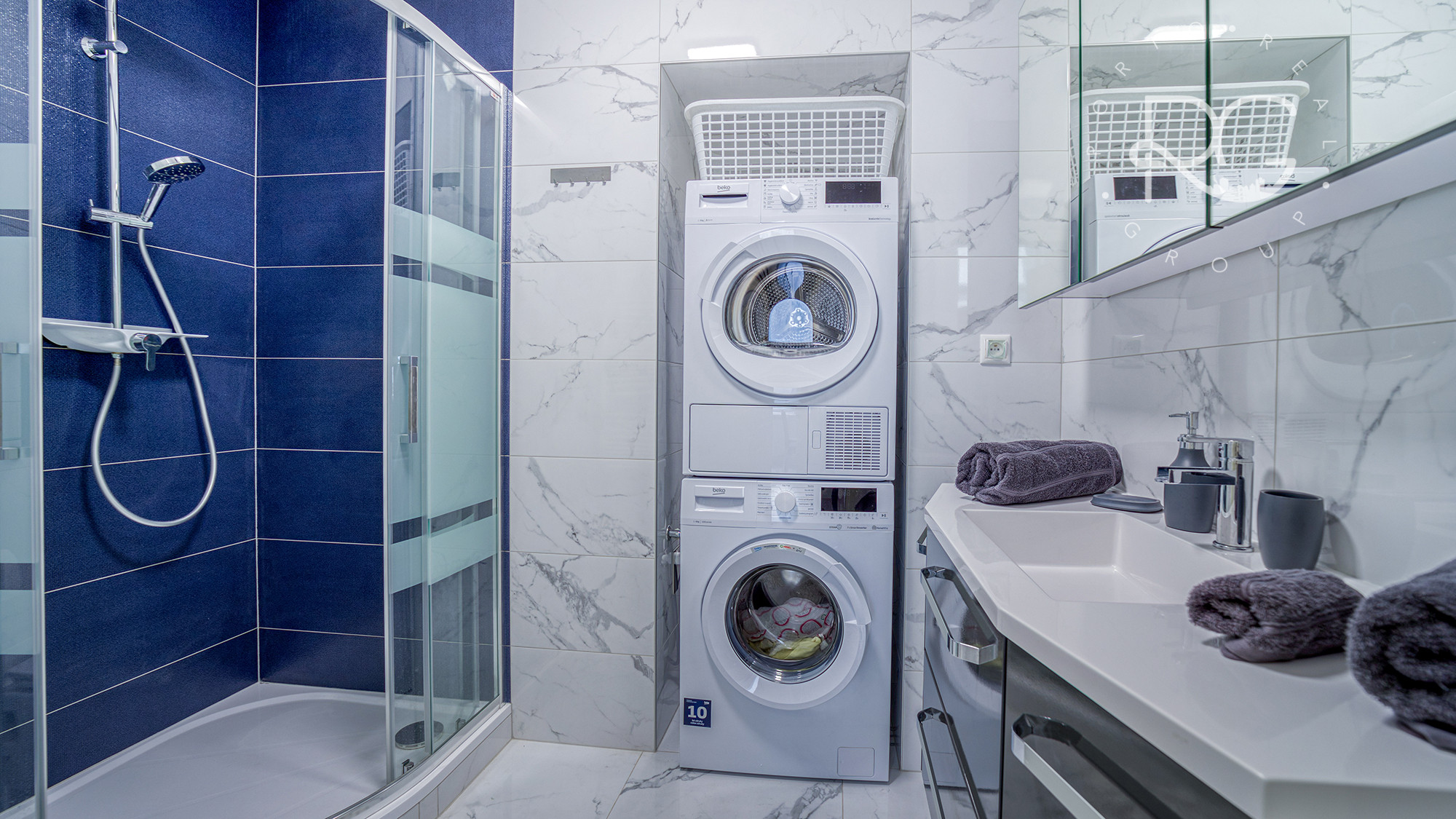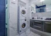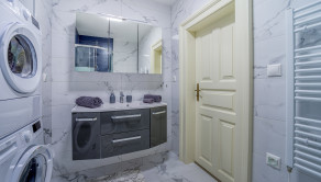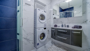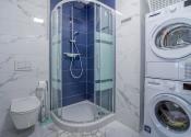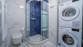 - kúpeľňa vybavená toaletou, umývadlom so zásuvkami, sprchovacím kútom, práčkou, sušičkou a zrkadlom